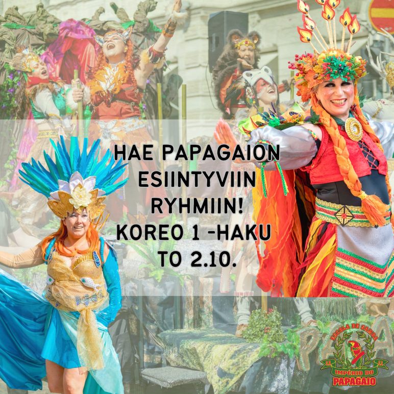 Papagaion esiintyvä ryhmä 1 eli kotoisammin Koreo 1 etsii muutamaa uutta tanssijaa esiintyjäkaartiinsa. Jos olet kiinnostunut karnevaalisambasta, yhteisöllisestä meiningistä, sambaesitysten tavoitteellisesta harjoittelusta ja kaipaat elämääsi piristystä (ja glitteriä!), tässä on mahdollisuutesi!